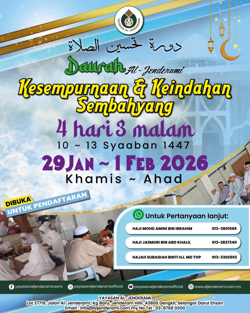 Daurah kesempurnaan & Keindahan Sembahyang akan diadakan selama 4 hari 3 malam bermula pada 29 Januari hingga 1 Februari 2026 | 10 hingga 13 Syaaban 1447H di Perkampungan Melayu Islam Al-Jenderami, Dengkil, Selangor.